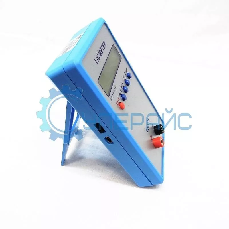 Жидкокристаллический экран с подсветкой экономичен. Питание LC тестера осуществляется тремя способами: через разъём mini-USB, от 4 батареек АА на 1,5 В или от блока питания на 5 В. Обратите внимание на наличие откидной подставки.