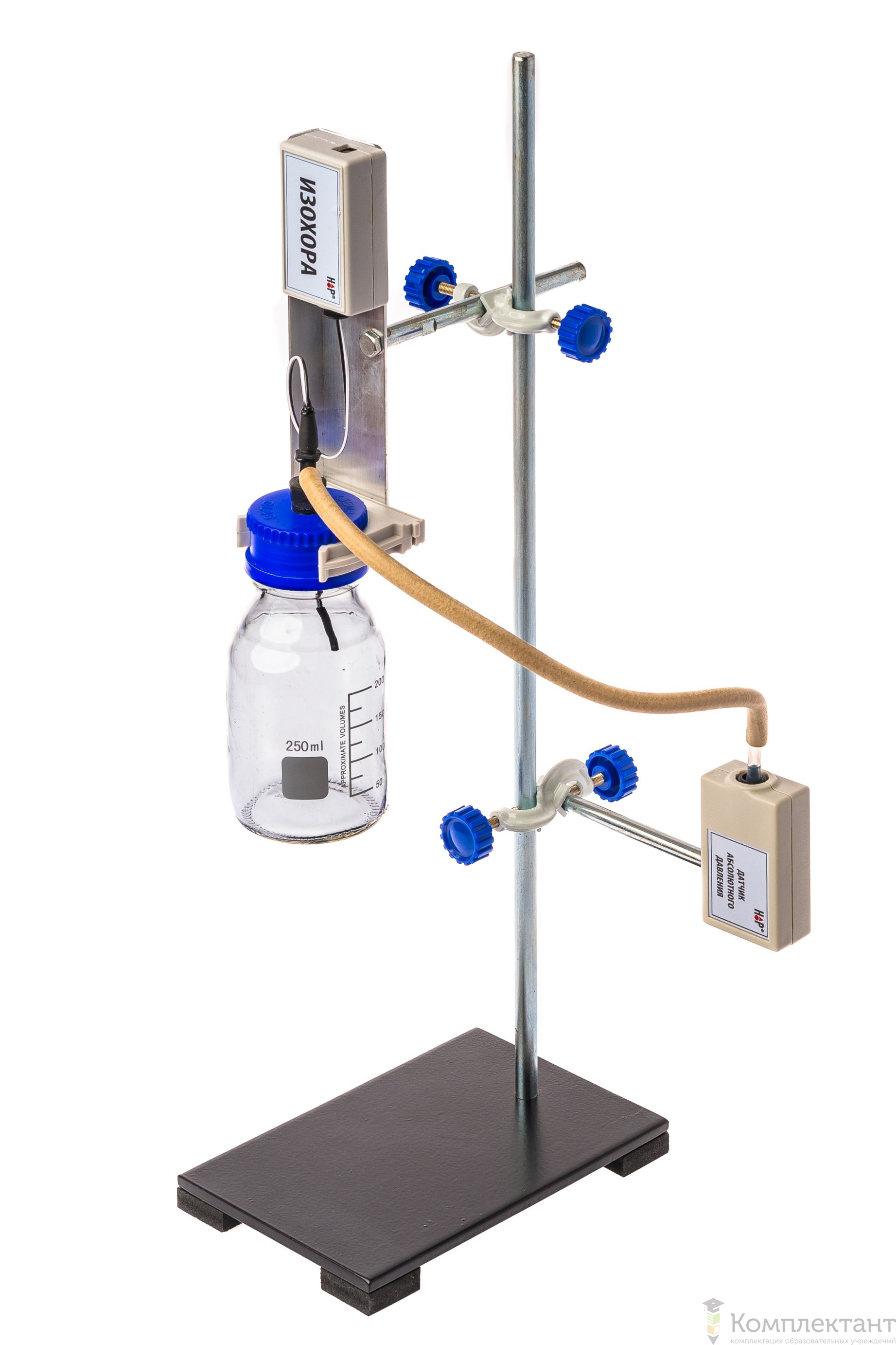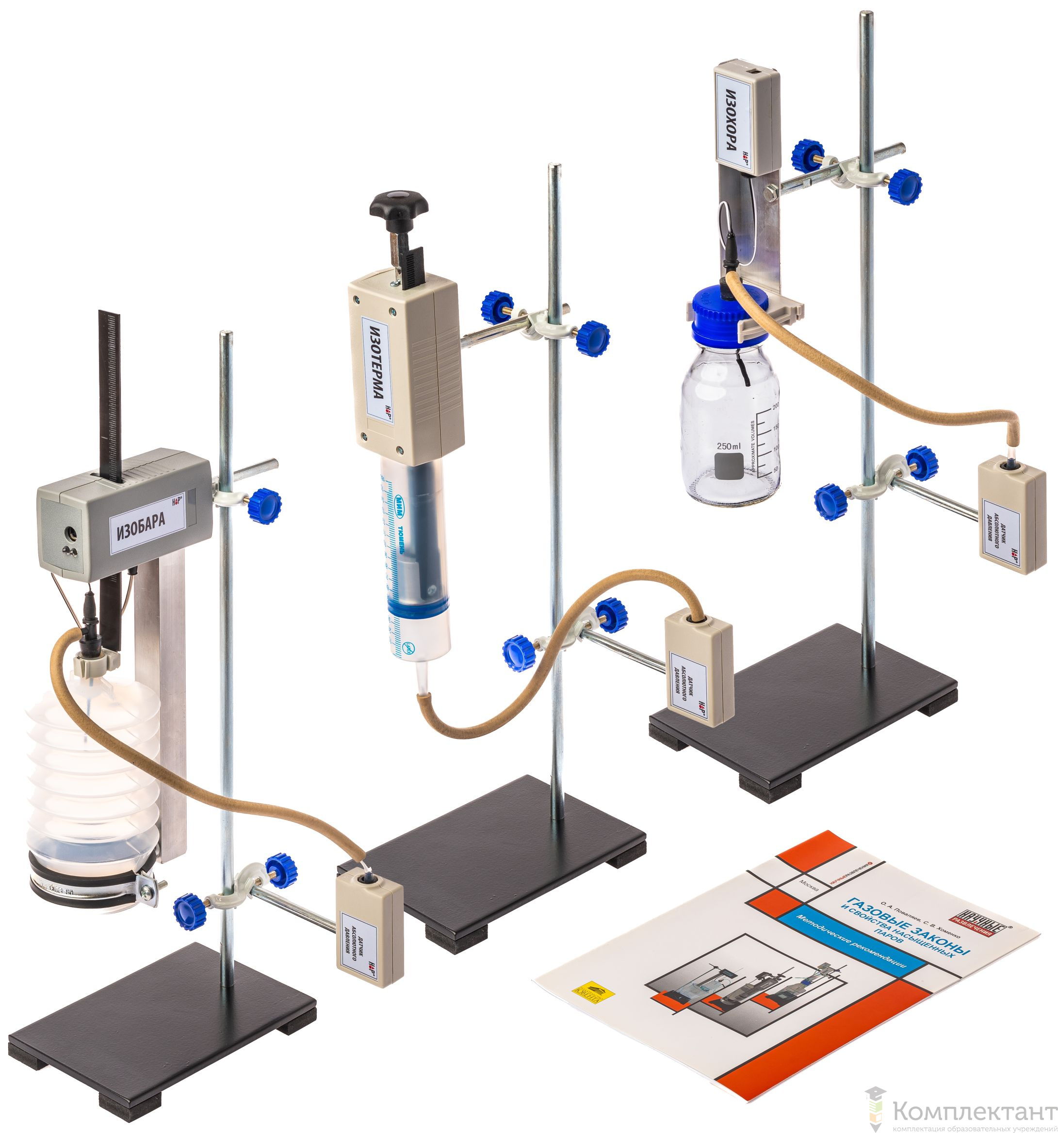 В состав набора входят три установки для осуществления изотермического, изобарного и изохорного процессов, которые имеют встроенные датчики объема и температуры, позволяющие регистрировать параметры газа в процессе изменения его состояния. Конструкция установок обеспечивает постоянство одного из параметров газа при варьировании двух других параметров. Для измерения давления газа применяется датчик абсолютного давления.