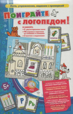 Игровое пособие Поиграйте с логопедом могут использовать для занятий как профессиональные логопеды, так и родители для игр с детьми дома. С помощью данного обучающего пособия можно провести разных несколько игр - «Слоги на ладошках» для освоения слоговой структуры слова, «Разыскиваются звуки» для понимания разницы между твердыми и мягкими звуками, «Где стоит ударный слог» - ударение в словах, «Вокруг да около» - правила употребления предлогов, «Три собаки, два кота» - согласование числительных с существительными», «Мой, моя, мое» - притяжательные местоимения. Как известно, именно эти вопросы вызывают наибольшие трудности при освоении детьми родного языка. В процессе игры все эти сложные понятия усваиваются намного проще. Часть игр построена по принципу игры-лото, часть - карточки с заданиями.