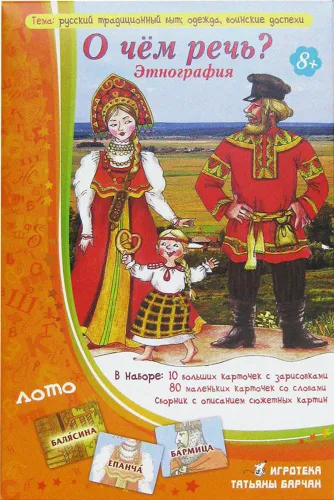 Лото «О чем речь?» познакомит детей с традиционными русскими обычаями, расскажет о том, как жили наши предки. Дети услышат старинные русские слова, пословицы и узнают, что они обозначают. В наборе есть небольшое пособие, в котором вы найдете много полезной информации о том времени, в котором жили наши прабабушки.